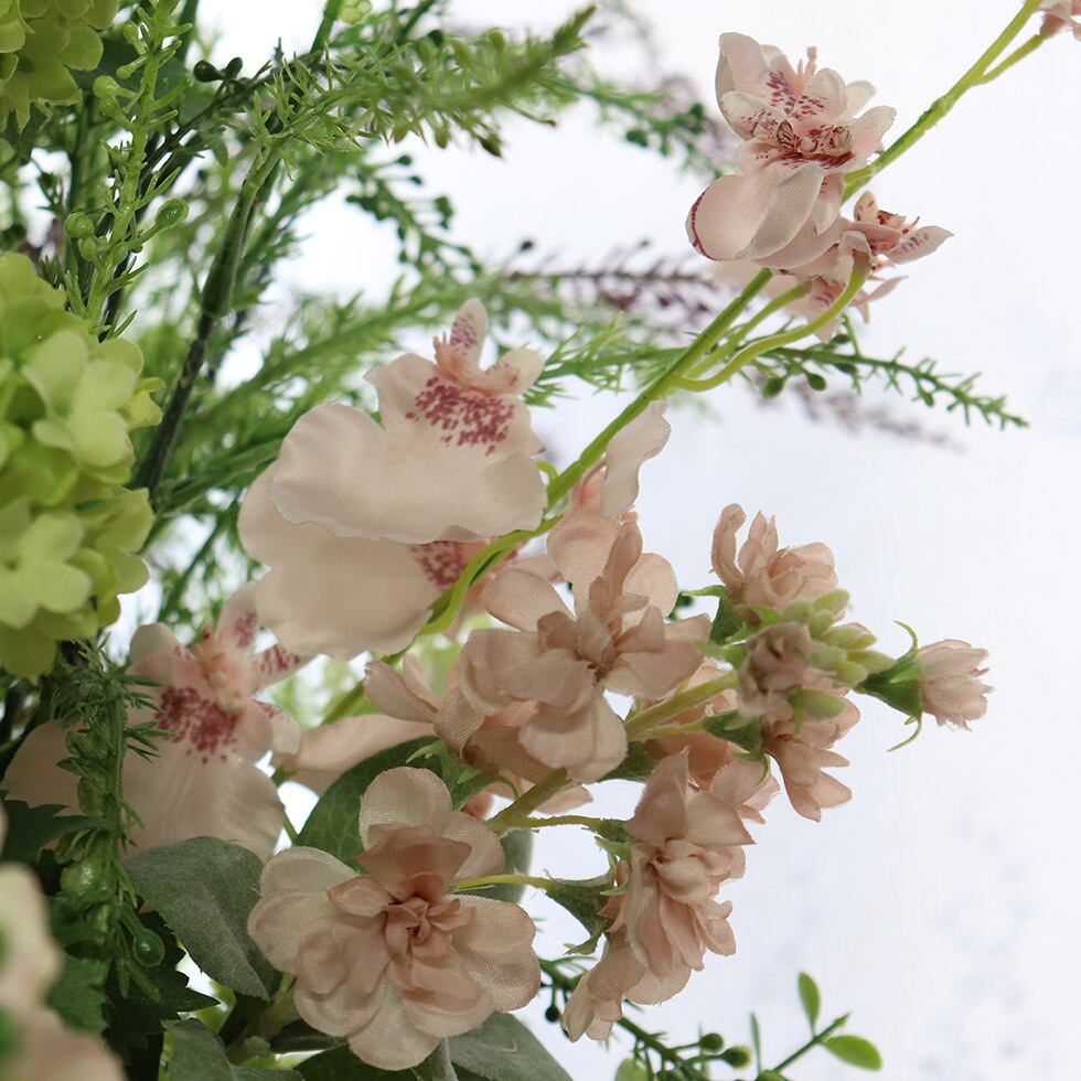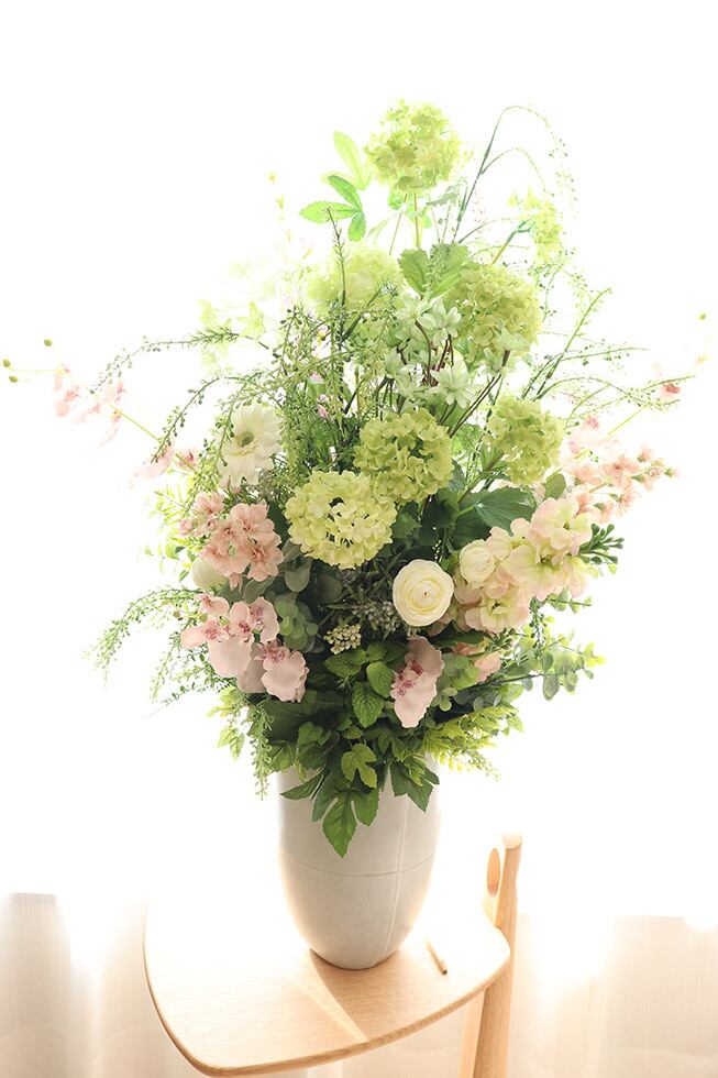 やさしいピンクやグリーン、ホワイトの花々を使用したアレンジです。